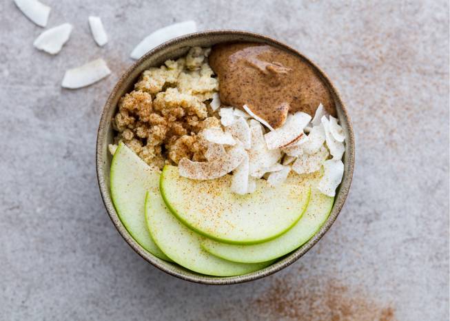 - Sobald die Mischung gar ist, aus der Pfanne nehmen und in eine Schüssel geben. Mit Apfelscheiben, Erdnussbutter, Kokoschips und Zimt toppen. Wer es süßer mag, kann noch etwas Honig oder Agavendicksaft darüber geben.