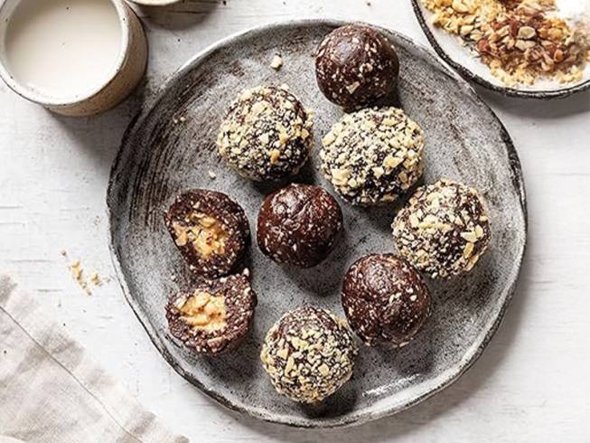 Die Erdnüsse fein hacken und die Energiekugeln darin wälzen.